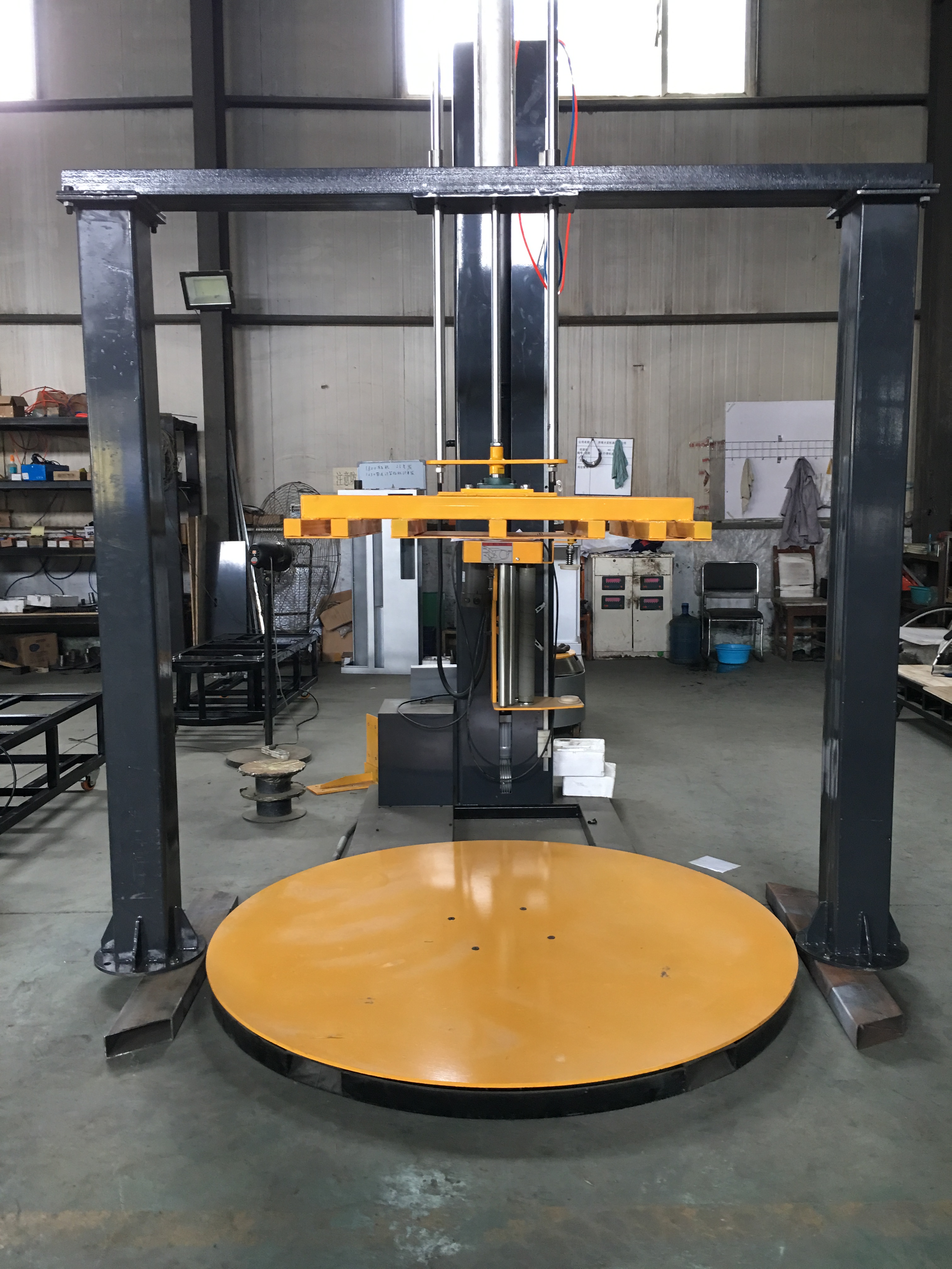 1、货物比较散。所谓的货物比较散,最典型的就是一个托盘上面落很多产品,在转盘转动或者缠绕的过程中货物容易散落,这种情况下就需要选择压顶缠绕