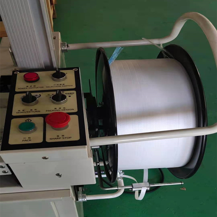 6、拿着打包带的头就从底部装线,再到上面,打包带的头推进打包机的入口处